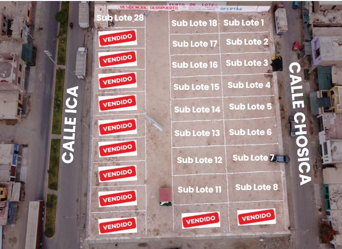 ¡Terreno Desde 90 m² Independizados E Inscritos en Sunarp! Listo Para Construir ¡Construye tu futuro en Pisco! Elige el lote ideal para tu familia o como inversión. Lotes urbanos desde 90 m2 hasta 105 m2, ubicados frente al Aeropuerto de Pisco, con acceso por Calle Ica, Calle Jorge Chávez y Calle Chosica. ¡Título de propiedad independizado y listo para construir! ¿Por qué elegir nuestros lotes? - Ubicación privilegiada: Frente al Aeropuerto de Pisco, con excelente conectividad y acceso a servicios. - Tamaños para ti: Lotes desde 90 m2 hasta 105 m2, ideales para viviendas o negocios. - Documentación en regla: Título de propiedad independizado y listo para construir. ¡Tu sueño, tu realidad! Construye la casa que siempre quisiste o invierte en un terreno con gran potencial. ¡No esperes más! Contáctanos para conocer los lotes disponibles y encontrar el perfecto para ti.